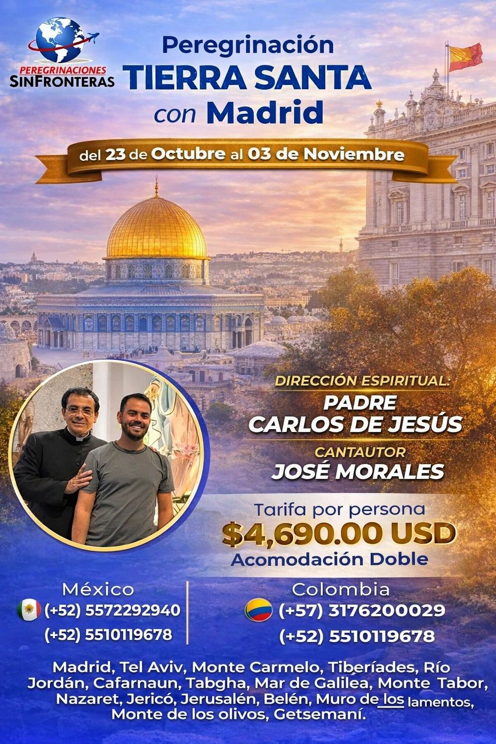 🙏 Incluye Eucaristía diaria, guía espiritual Padre Carlos de Jesús, acompañamiento musical, hoteles 4*, desayunos y cenas, 8 comidas en ruta, vuelos internacionales (CDMX–Madrid–Tel Aviv–CDMX), transporte en autobús de lujo, guía profesional en español, entradas según itinerario, seguro de viaje (hasta 69 años), auriculares y diploma del peregrino.